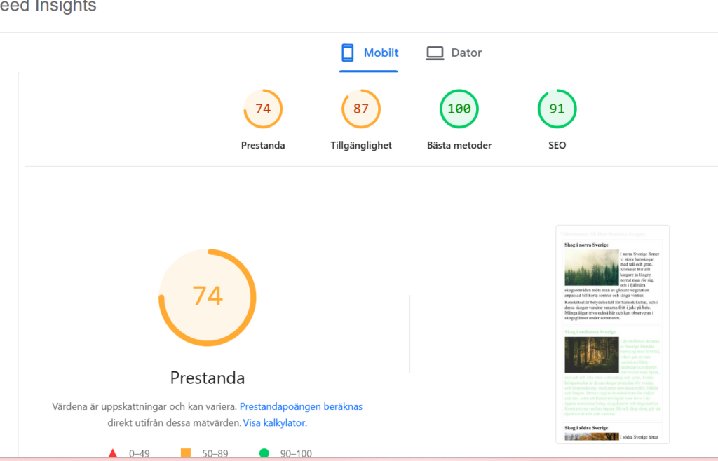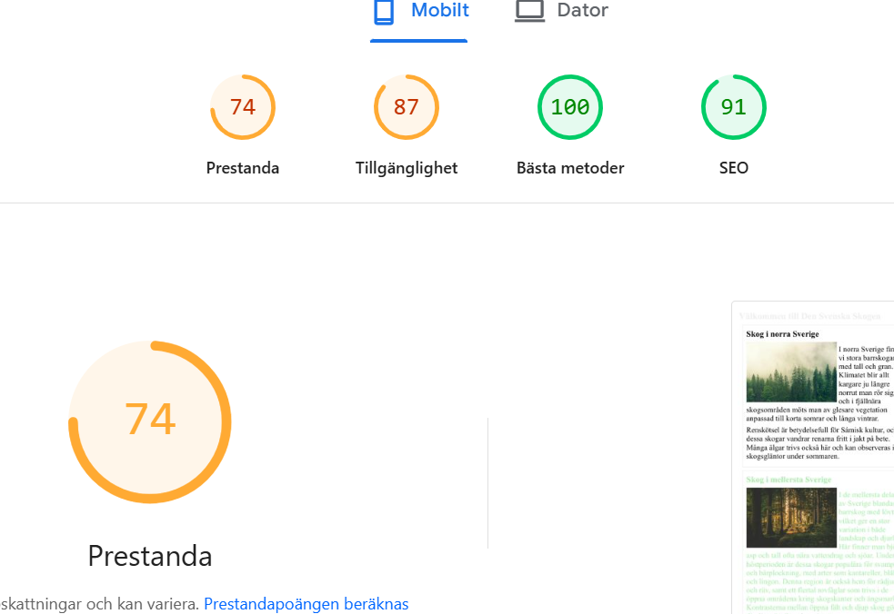 Jag tycker att ändringarna på bilderna gjorde skillnad eftersom att prestandan gick från 74 till 87. Jag tror inte att man kan göra så mycket mer med bilderna för att få ett bättre resultat, så jag är nöjd.