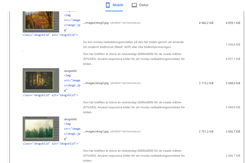 På de båda sidorna stod det att det var bilderna som var det största problemet och att de tar längst tid att laddas in eftersom att de var större än nödvändigt.