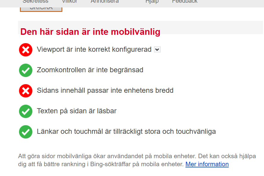 - Kolla mobil vänlighet: https://www.bing.com/webmaster/tools/mobile-friendliness.